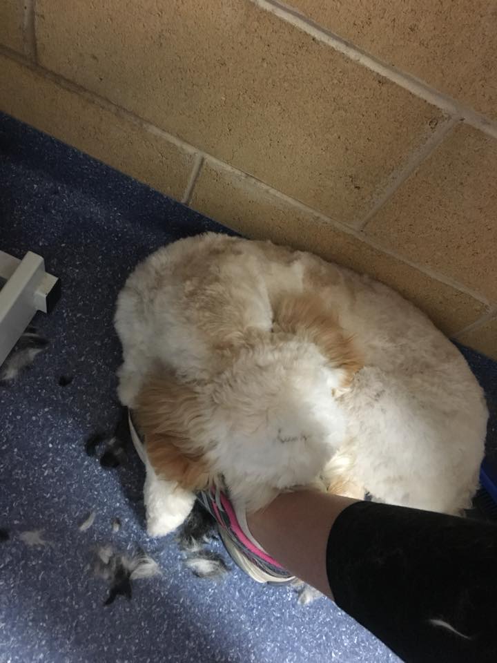 This beautiful boy is Boston the labradoodle. He has his routine when he comes in for his groom. First lots of play time, then groom, then at the end of the groom, fall asleep on table, then when on floor he will sit near my legs. At his last groom I felt him literally wrap his paws around my leg and fall asleep. Man dogs are just the best creatures on earth.